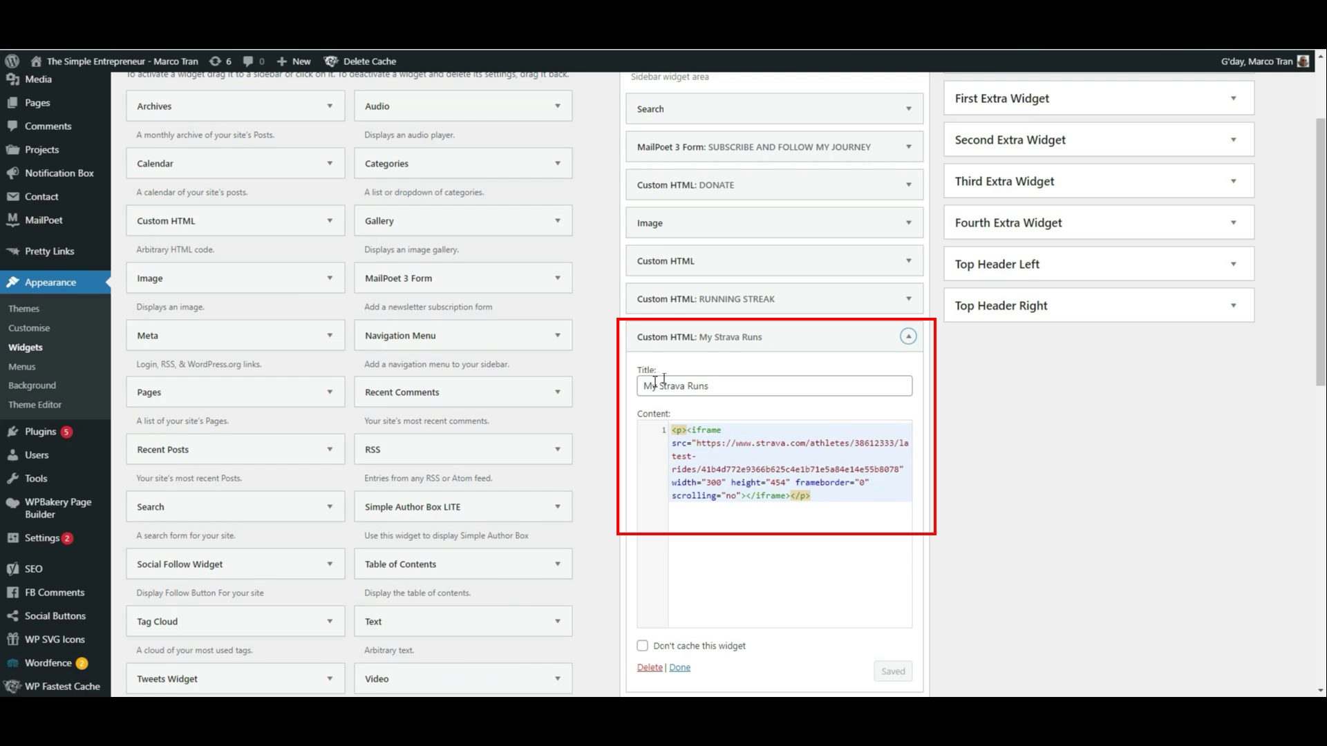 - View the website and you should see it in the sidebar. You can also add the Strava widget to a page or a post and the process would be the same