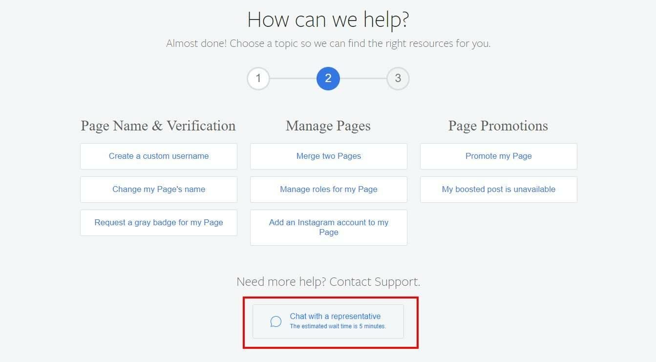 Depending on whether the Facebook support staff are available for a chat, you will be displayed with two different forms. Here’s the form you will need to complete if chat is available: