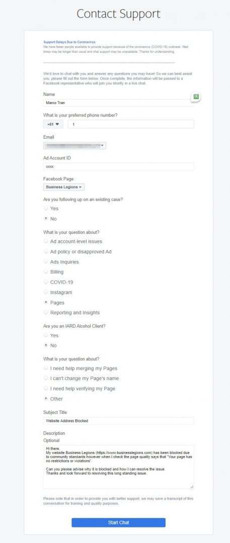 I have managed the Facebook Page for a number of years and all the posts I shared on Facebook are related to technology or business, I’m not sure why it was being blocked by Facebook. In any case, I decided to reach out to the Facebook App Review Support Chat (I thought it would be quicker to chat to someone and get it resolved). This was my initial contact: