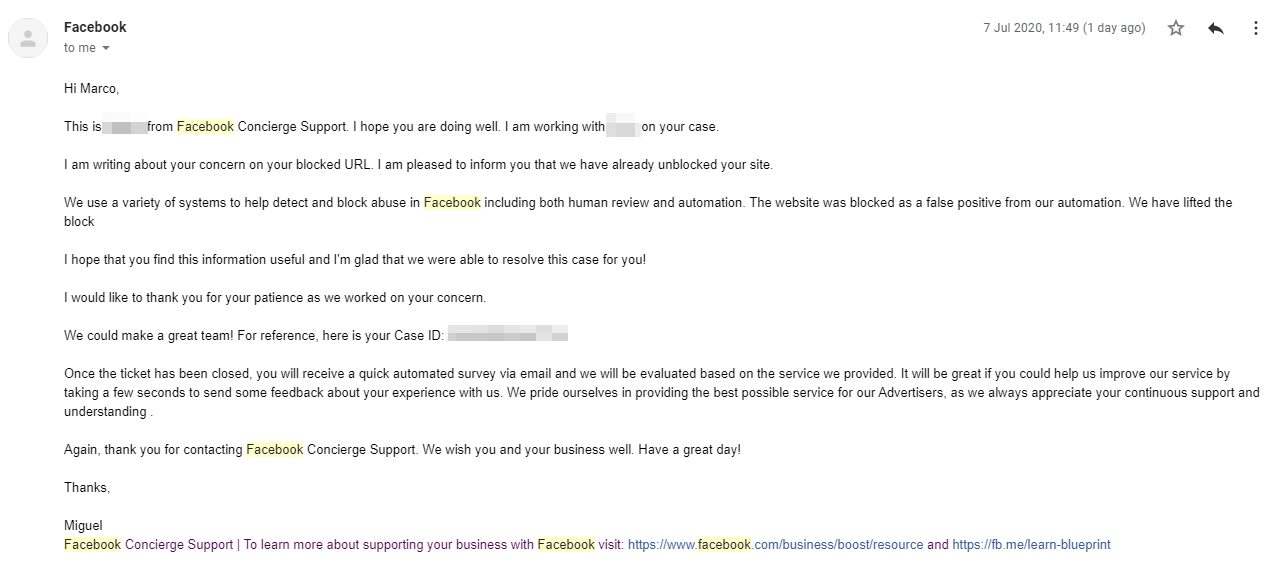 I sent the form and surprisingly, the next day I actually received a response back from the Facebook Concierge Support. It was the first time that I actually received any responses back so I knew I was heading in the right direction to have this issue resolved. They asked me a few questions, ie what the URL was that is blocked and then a few days later I received this email saying it has been unblocked: