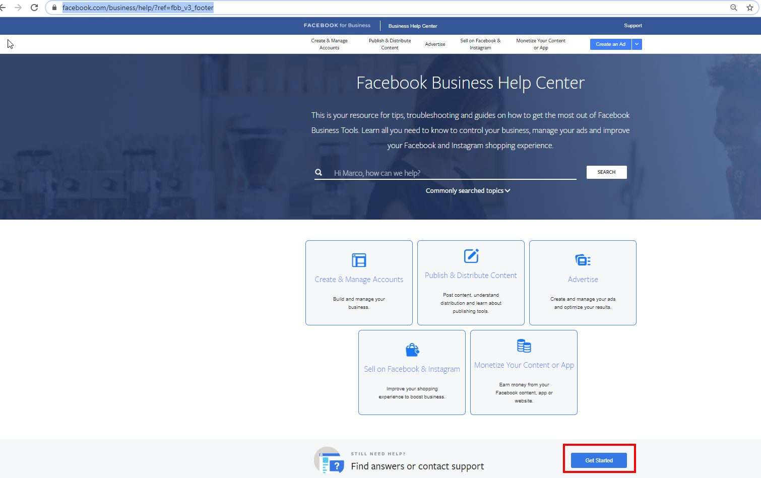 Go to the Facebook Business Help Center: https://www.facebook.com/business/help/ and click on Getting Started button at the bottom. Make sure you are logged into your Facebook account otherwise you will not see some of the steps below.