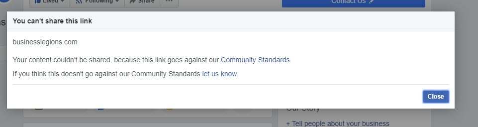I finally managed to get the website businesslegions.com unblocked on Facebook and I wanted to share how I did this so you don’t have to go through the same pain that I did. I initially discovered the website was blocked from being shared on the Facebook Page – Business Legions on the 19th of November 2019. The error message “Your content couldn’t be shared, because this link goes against our Community Standards. If you think this doesn’t go against our Community Standards let us know.”
