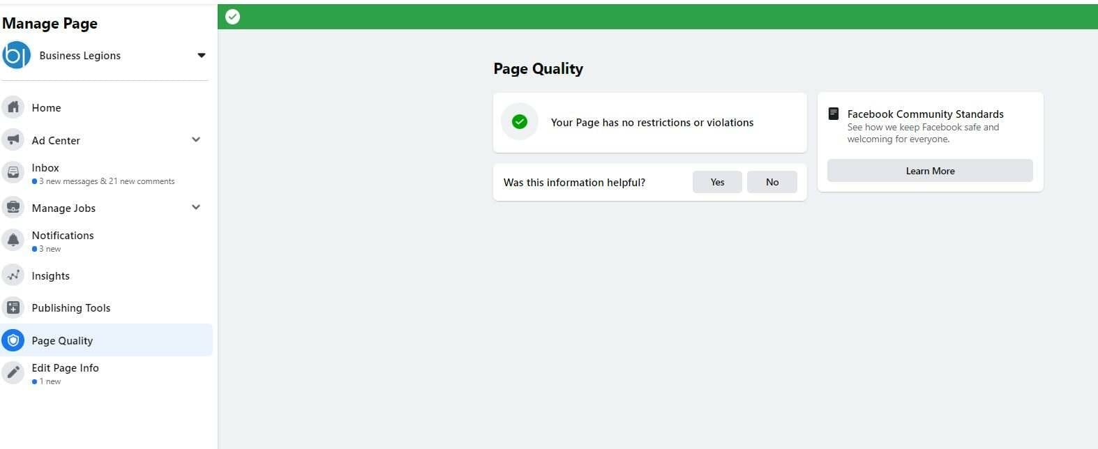 My website Business Legions (https://www.businesslegions.com) has been blocked due to community standards however when I check the page quality says that “Your page has no restrictions or violations”.