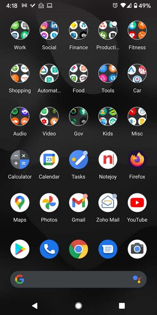 The idea is to be more organised and not have multiple screens with scattered mobile app shortcuts. On the main screen, I placed the app shortcuts in groups/folders so that they can be easily located based on the type of app or category. I also directly added the most important or frequently used app shortcuts such as Calculator, Calendar, Tasks, Notejoy, Firefox, Maps, Photos, Gmail, Zoho Mail, YouTube, Google Play, Phone, Chrome Browser, Messages and Camera on the last 3 rows of the screen.