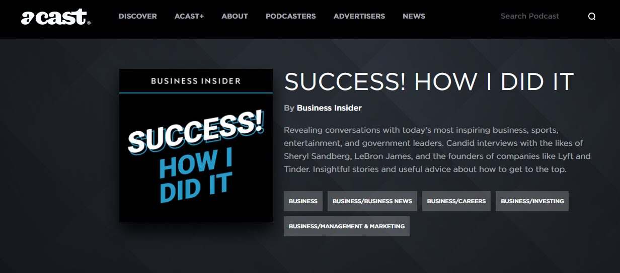 Success! How I Did It – these podcasts are from Business Insider. The host Alison interviews great entrepreneurs like the CEO of Dropbox Drew Huston, Barbara from Shark Tank, founders of Lyft and Tinder. I streamed and downloaded the audio using the app called acast.