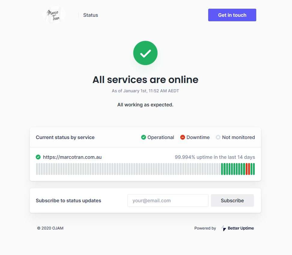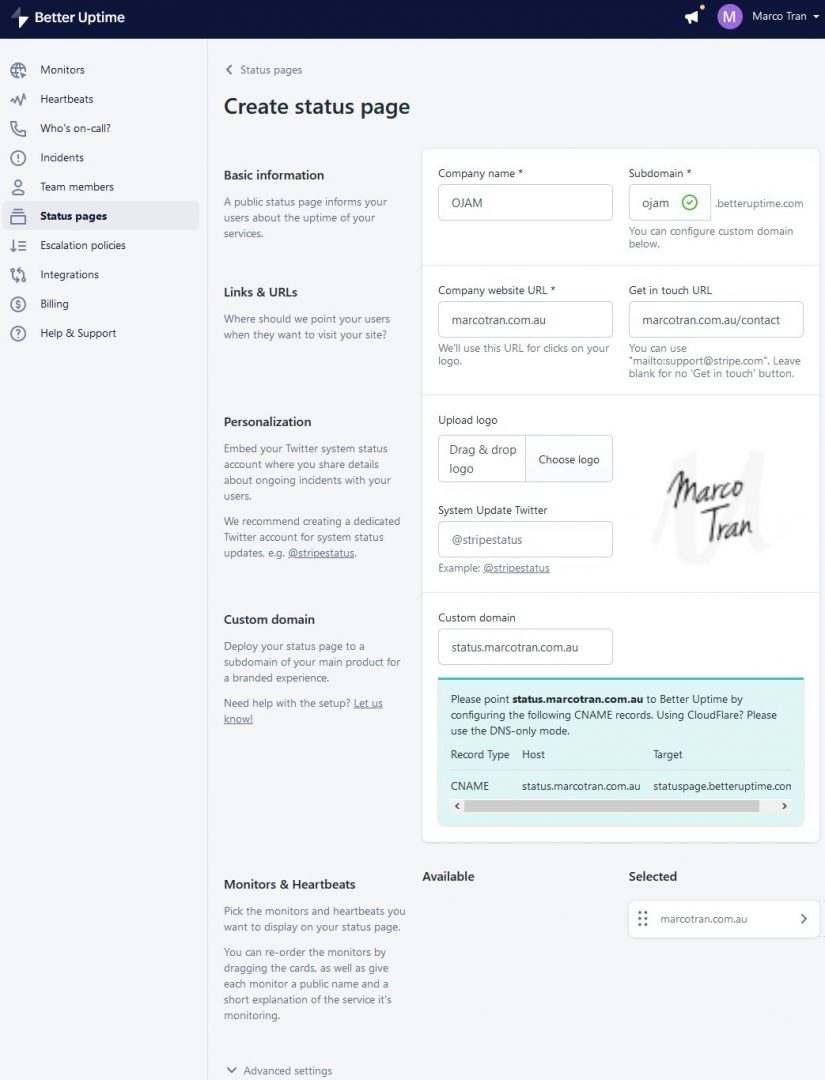 I used the custom domain status.marcotran.com.au and it needs to be pointed to statuspage.betteruptime.com