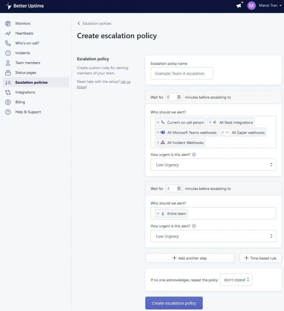 I haven’t used this feature since we don’t have a large team but here are the options available. You can configure and send alerts to different services such as Slack, Zapier, Microsoft Teams, Webhooks, SMS etc based on time periods after an incident has occurred. You can then repeat the policy if no one acknowledges the incident – this will ensure the issue is resolved faster.