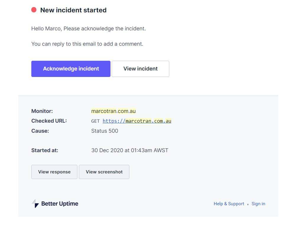 I’ve set up Better Uptime to send notifications via email, Slack and via the Better Uptime mobile app. There is also the option for Better Uptime to call you or send an SMS to your mobile.