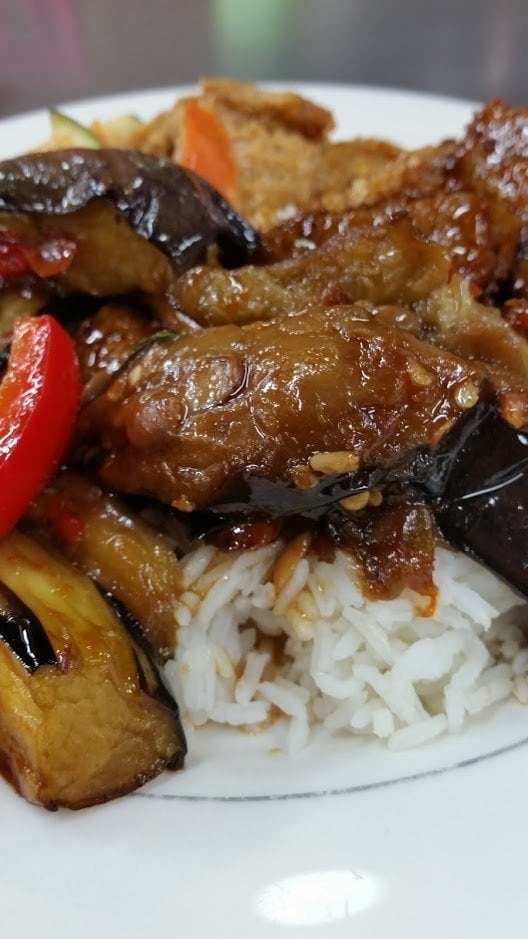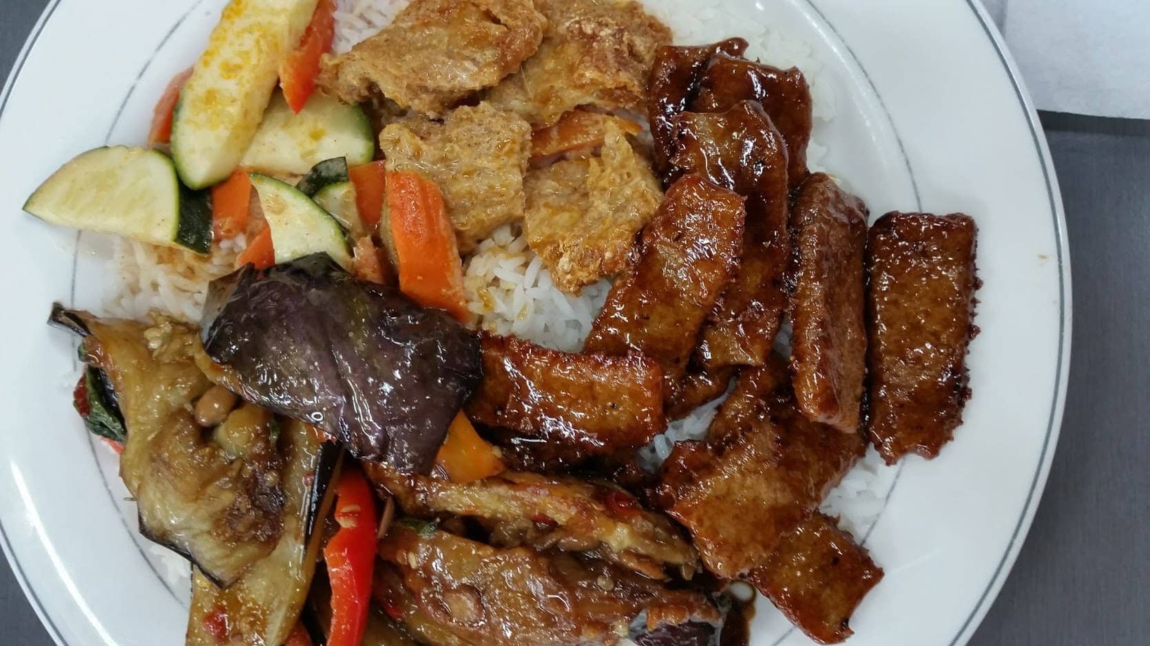 Vegan/Vegetarian Blossom Lotus – Rice with 3 dishes (Black Bean Vege Tofu, Eggplant Chilli and Basil, Crispy Soy Slices) which only cost $10