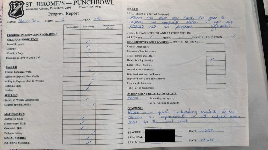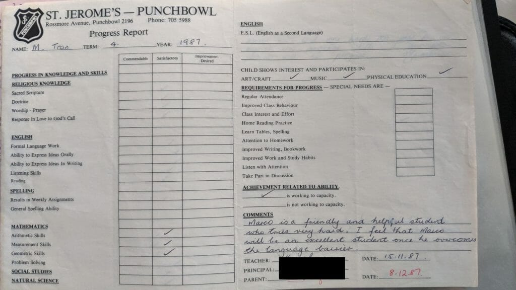 I wanted to show my gratitude to my teachers from Year 4 (1987), for their encouragement and positive comments they have given me. Let me share some personal information with you. For those of you who didn’t know, my childhood years were spent in Italy. My parents were refugees from Vietnam and we ended up in Italy around 1979. In 1987 my parents decided to migrate to Australia since that’s where most of their family resided and we came here without knowing any English.