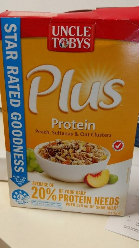 Cereal with Soy Milk. I purchased this when it was on special and it actually has Protein.