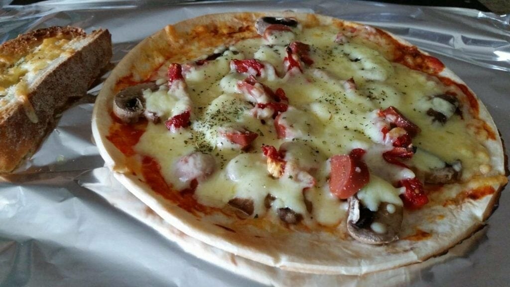 2x Pizzas (Cheese, Mushroom, Sundried Tomatoes, Vegetarian Hot Dogs) and bruschetta bread sprinkled with cheese